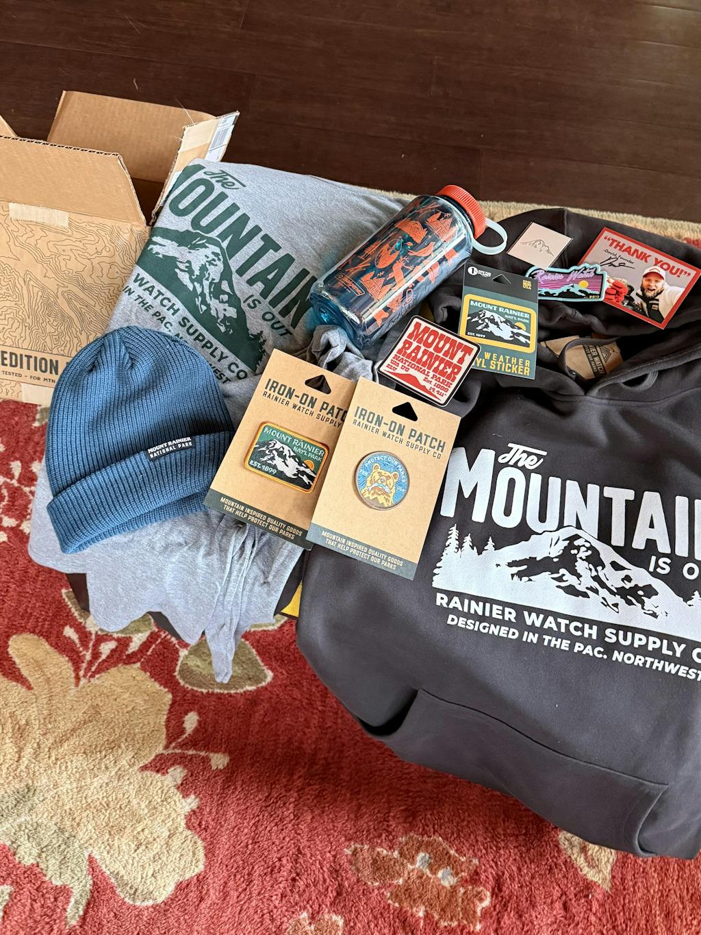 I’m usually not one to buy a mystery box because I like to have too much control over what I’m getting with my money spent. I was going to buy a new hoodie, could use a new shirt, needed a beanie, but also really really like their hats, and could use a new water bottle. The apparel from Rainier Watch is so soft and comfortable which led me to taking the gamble which totally paid off. Got the softest and best fitting log sleeved shirt I now own, a great new hoodie, softest and probably best fitting beanie I have, not to mention a new Nalgene and a handful of cool stickers and iron on patches. Totally recommend this and will buy again. I figured anything I couldn’t use would just make a great gift for anyone in my life, but I’m hoarding everything in this bundle for myself. 10/10 recommend. Plus, I love the giveback that Rainier Watch does with each purchase. It’s hard to go wrong when shopping with them. 🥰🏔️