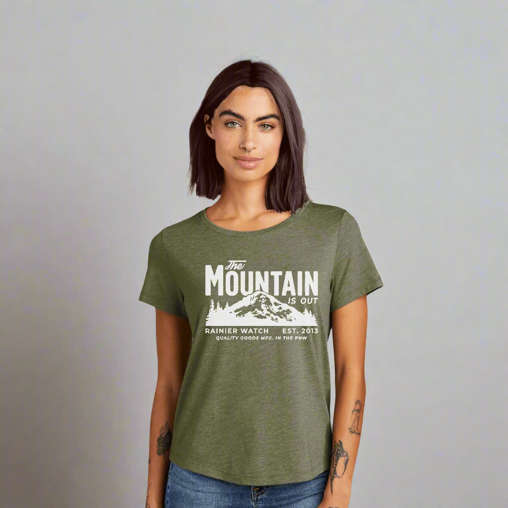 Ready to make a statement while protecting the environment? The Mountain is Out Womens Eco Tee in Forest Green is here for you! Made from recycled water bottles and organic cotton, this super soft t-shirt is designed and printed in the PNW. Join the eco-friendly movement and give back to parks while exploring in style. (Go green or go home!)