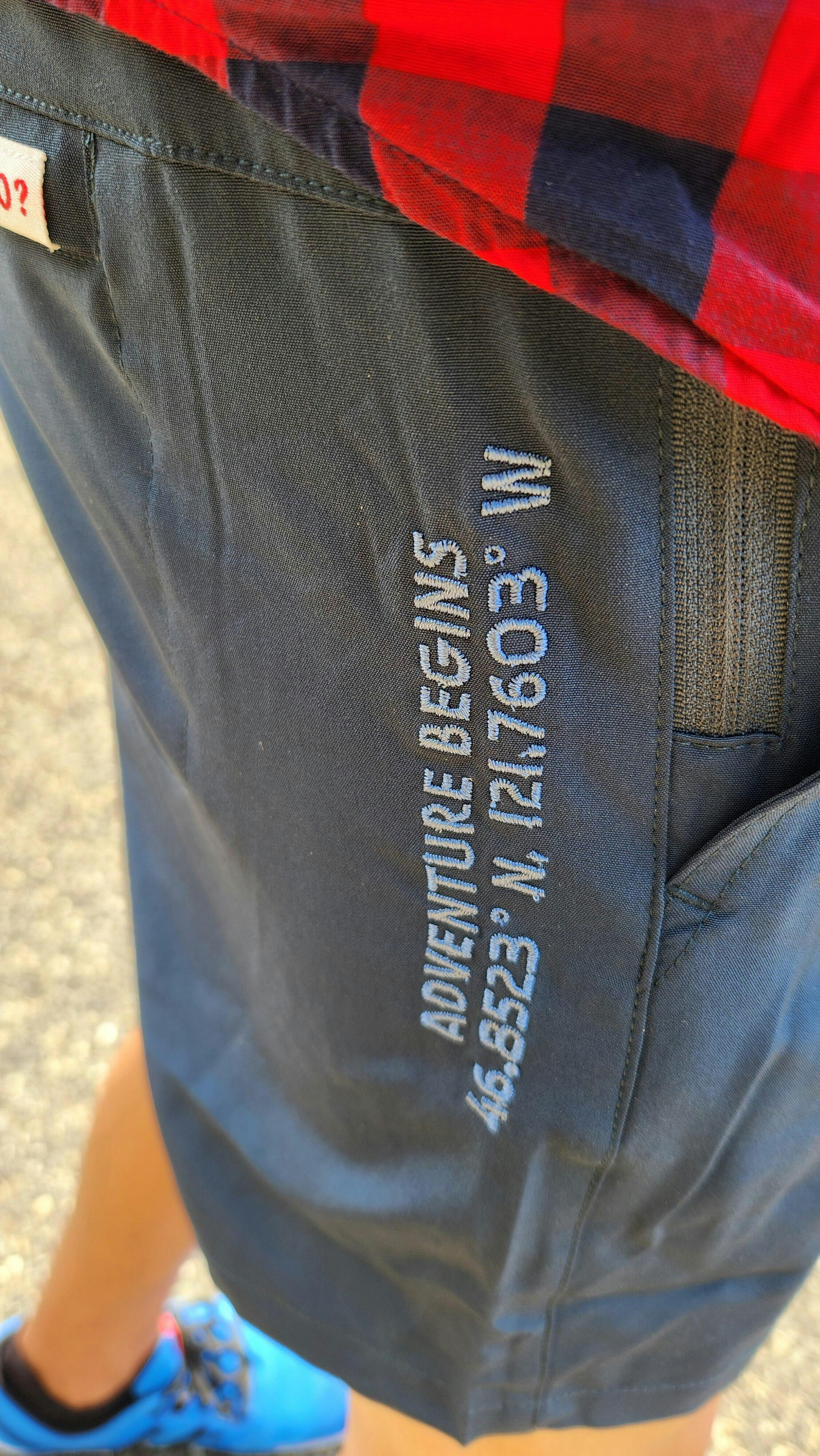 • embroidered "adventure begins" side detail